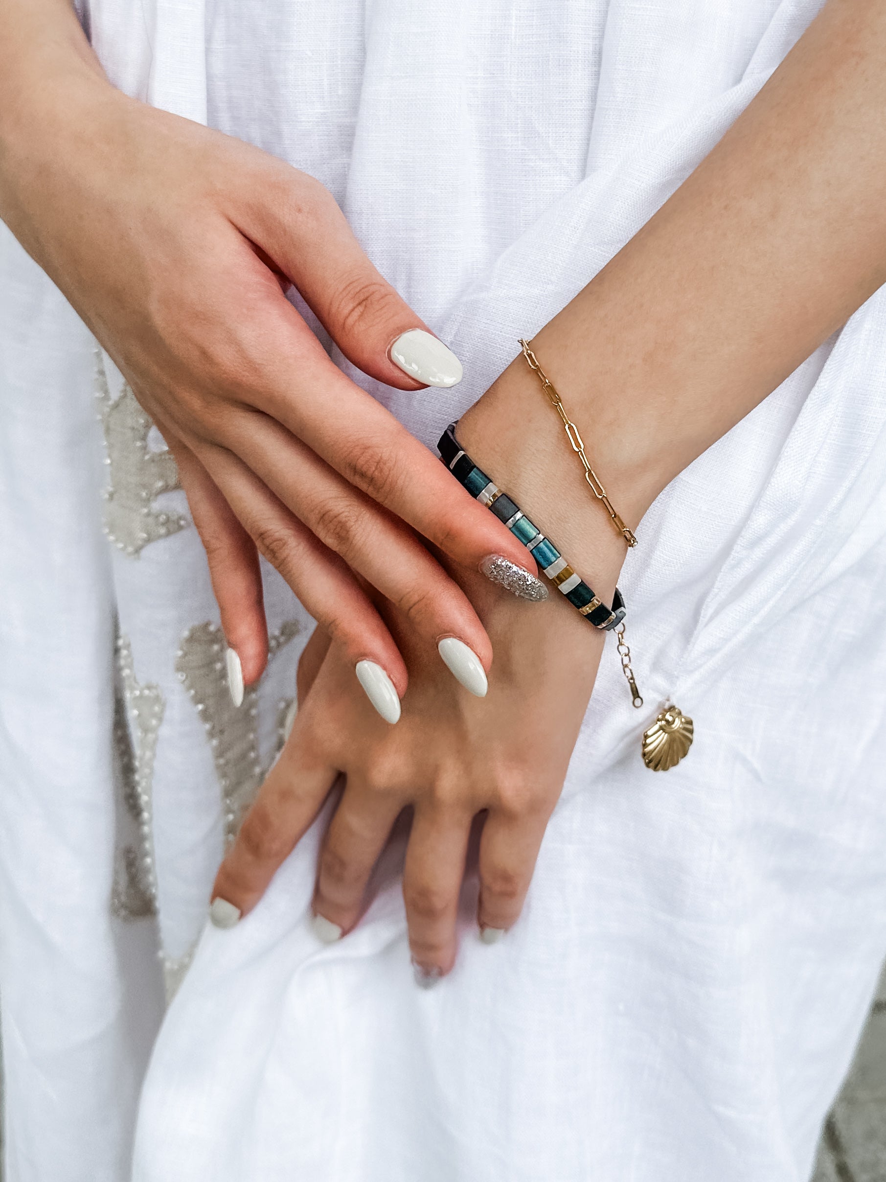 Although our glass beads are tempered to increase their durability, we recommend avoiding hard knocks, wide stretching or getting it snagged to avoid chips or breaking the beads. To maintain the longevity and shine of your bracelet, remove it before swimming and showering and avoiding contact with creams, lotions and fragrances.