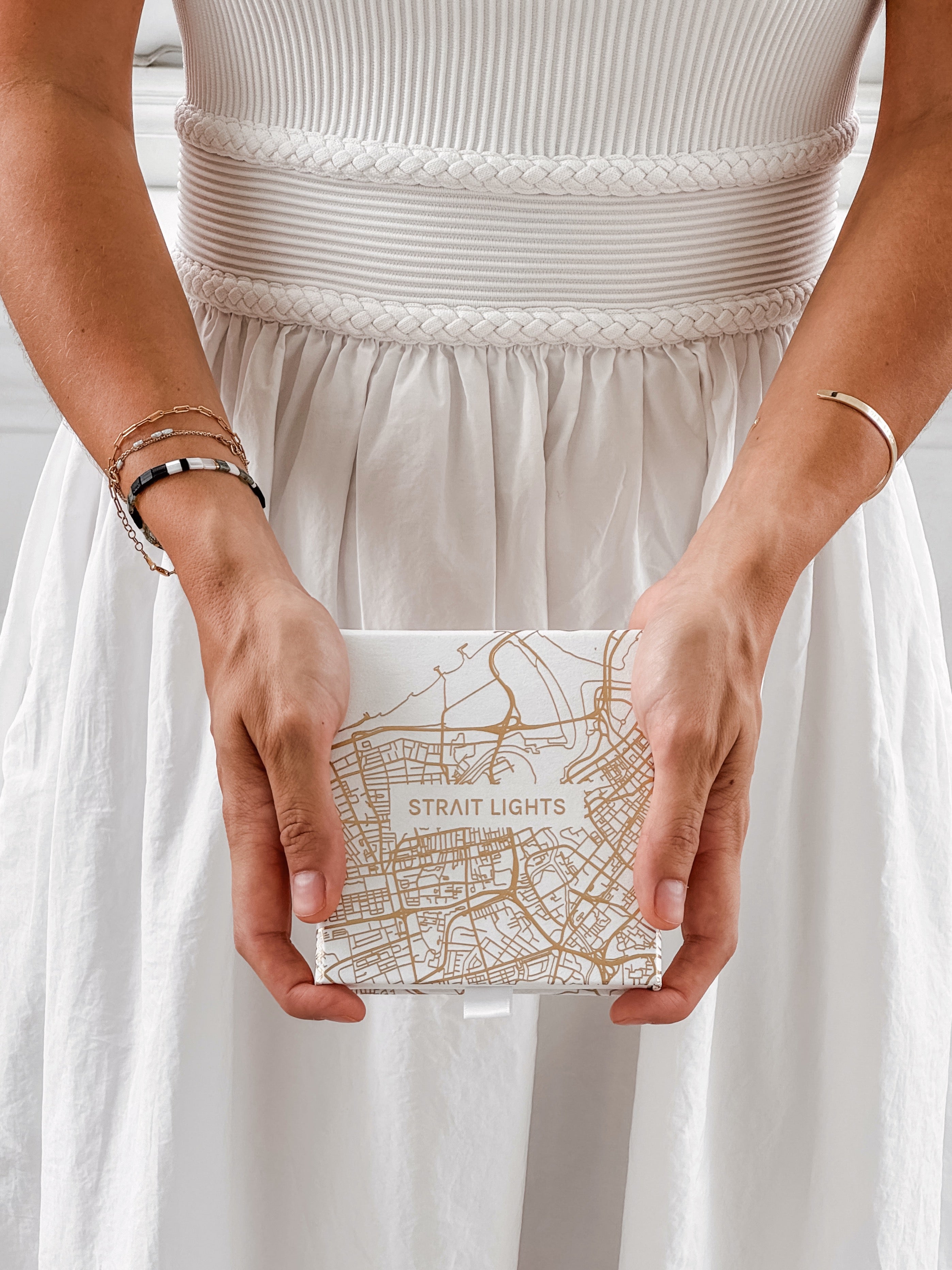 At Strait Lights, we’re on a mission to create beautiful gifts. Each of our bracelets is thoughtfully packaged in our iconic gold and white box with a card that shares the story behind the design. It’s not just pretty though, it’s also made responsibly through sustainable forestry.