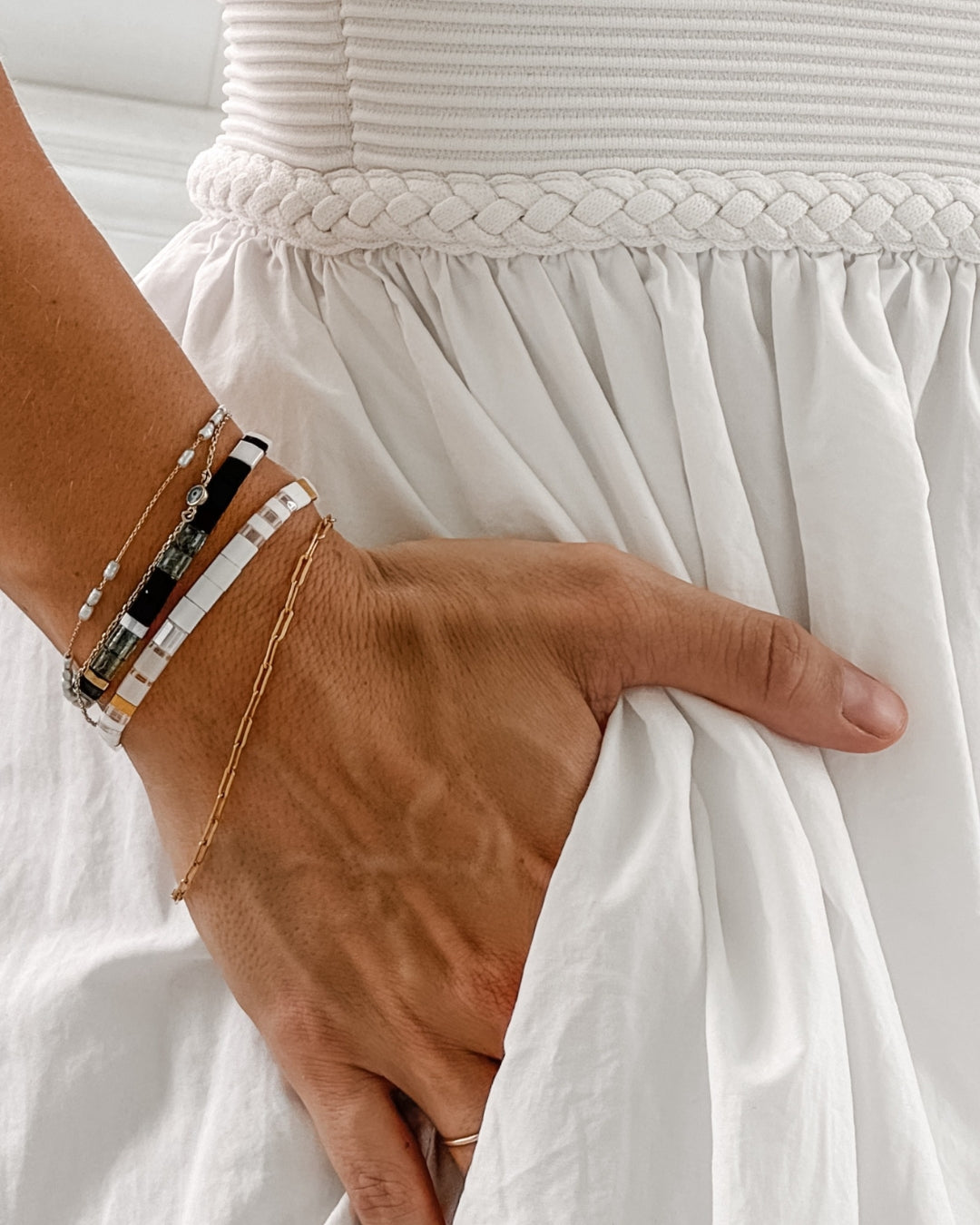 Although our glass beads are tempered to increase their durability, we recommend avoiding hard knocks, wide stretching or getting it snagged to avoid chips or breaking the beads. To maintain the longevity and shine of your bracelet, remove it before swimming and showering and avoiding contact with creams, lotions and fragrances.